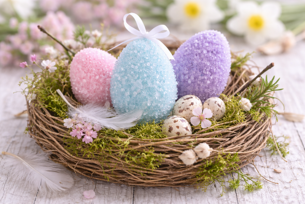 Das sieht nicht nur hübsch aus, sondern wirkt fast wie eine kleine Szene aus einem Märchen – als hätte der Osterhase seine funkelnden Eier dort abgelegt.